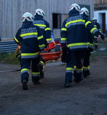 Mehrere Atemschutztrupps drangen in das verrauchte Gebäude vor. Gasflaschen wurden in Sicherheit gebracht, zudem wurden zwei eingeklemmte Personen (Dummies) vorgefunden, die mit hydraulischem Gerät befreit wurden. Auch der Fahrer eines Lkw befand sich noch im Gebäude. Er wurde gerettet und mittels Trage abtransportiert. Vielen Dank an die FF Damtschach für die Organisation der Übung und für die anschließende kulinarische Verpflegung. Ein Dank ergeht weiterhin an Kameradin Lena Poderznik (FF Damtschach) für die Bilder.